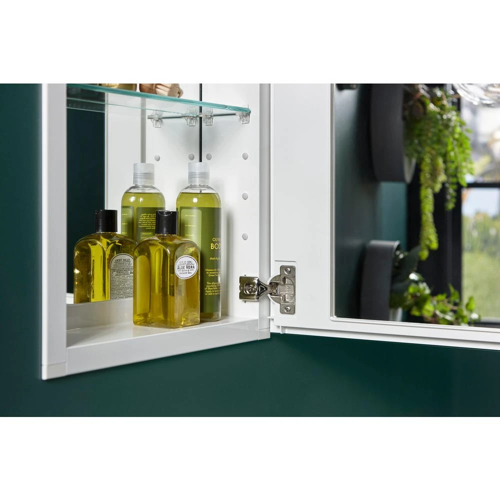 With mirrored surfaces inside and outside, this 15 in. frameless medicine cabinet helps you put your best face forward. Inside, two height-adjustable glass shelves easily accommodate your toiletries.