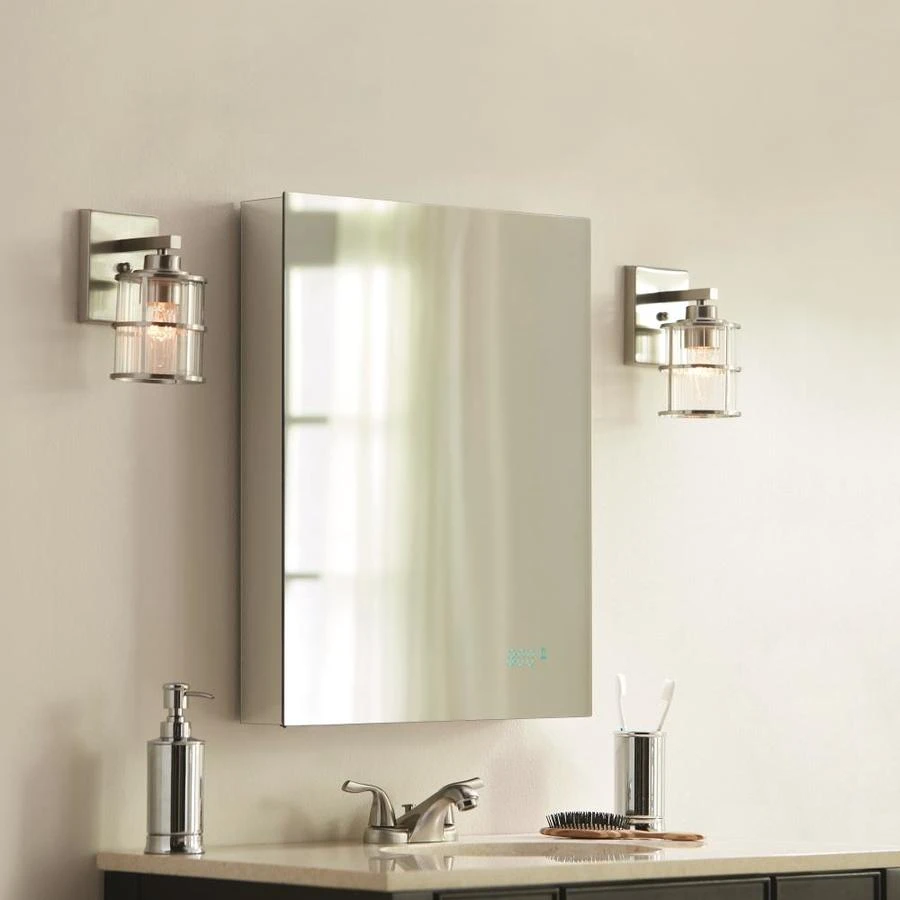 The 20 In. x 26 In. surface mount medicine cabinet with frame less translucent beveled mirror has a digital clock display on right bottom corner of the front door