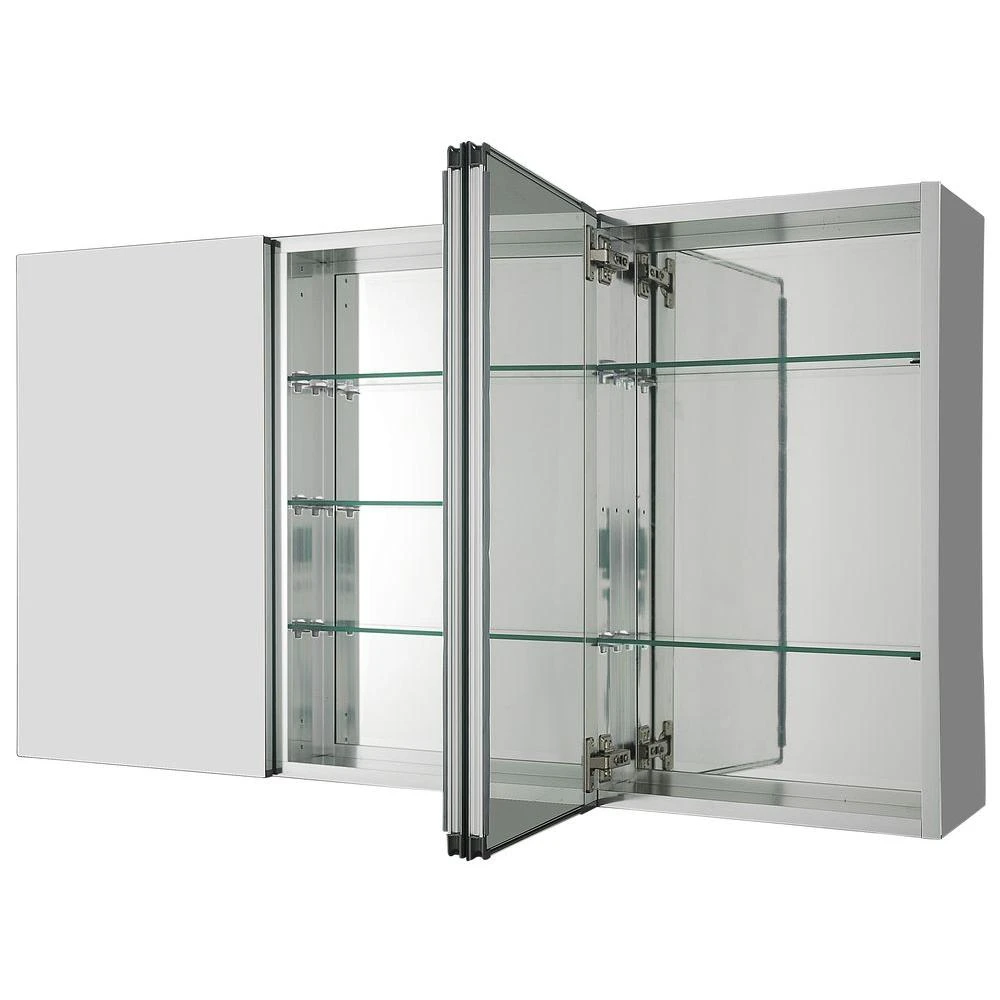 This mirrored cabinet features a Tri-view beveled frameless door that can be installed with hinge. Inside, six glass shelves hold all your toiletries and bath items. Rust-free aluminum construction with mirror back ensures years of use. A side kit is included for recess or surface mount.
