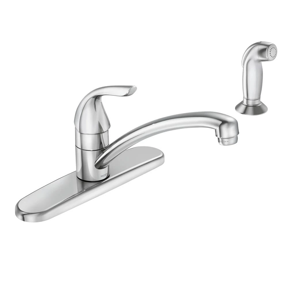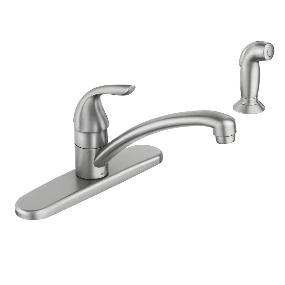 With its smooth curves and minimalistic design, the Adler one-handle faucet seamlessly blends with a variety of kitchen decor preferences. The one-handle lever makes it easy to adjust the water, and a matching side spray is included to make cleanup simple. Thanks to the new tool-free faucet installation method, Adler installs 40% faster than MOEN faucets without the new installation option. Available in a Chrome or Spot Resist Stainless Steel finish.