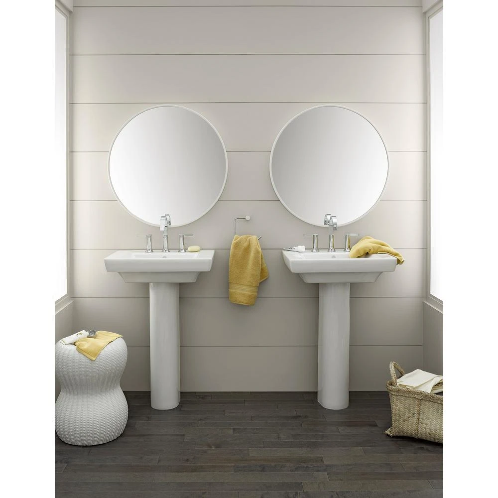This American Standard Boulevard 5 in. Pedestal Sink Basin in White sports a sleek form constructed of vitreous china for a durable, attractive addition to your bathroom. A flat bottom offers a versatile design that can be set up as both a countertop and above-counter sink. The 4 in. faucet drillings allow for the installation of hardware (sold separately) to give you a custom look.
