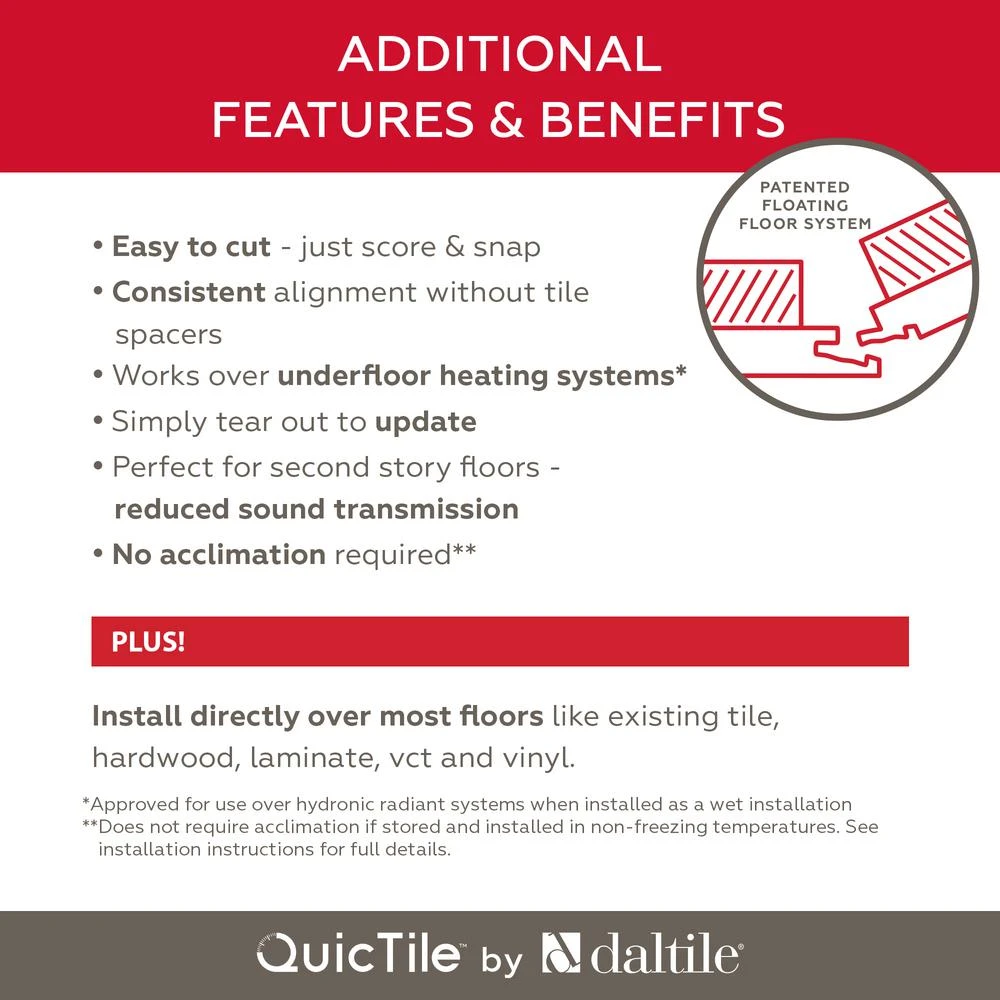 QuicTile by Daltile 12 in. x 24 in. porcelain floor tile in polished Panda Marble is tile reinvented. With the patented floating floor system, you can install real porcelain tile in one day. It takes just 3-easy steps – lay down underlayment, click the tiles together, and grout and go. It’s quick, it’s easy, and it’s beautiful. The polished Panda Marble tile is a bold and luxurious marble look giving any room a modern update. QuicTile offers maximum durability; it’s waterproof, stain-proof, dentproof and scratch-resistant. Use this marble look in a bathroom or entryway to create a beautiful and eye-catching space.