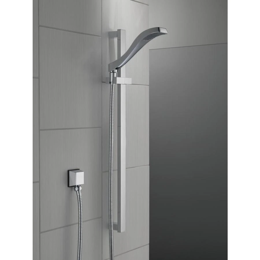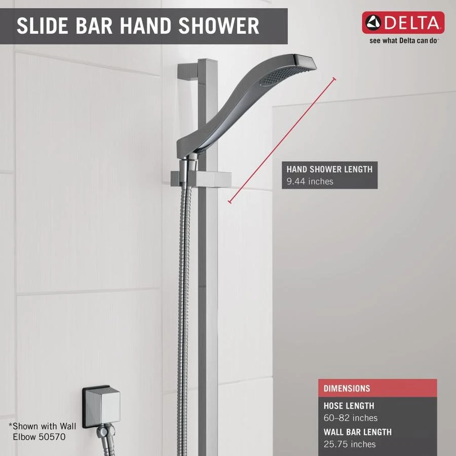 Includes 60-in – 82-in stretchable metal hose for extended reach within the shower
