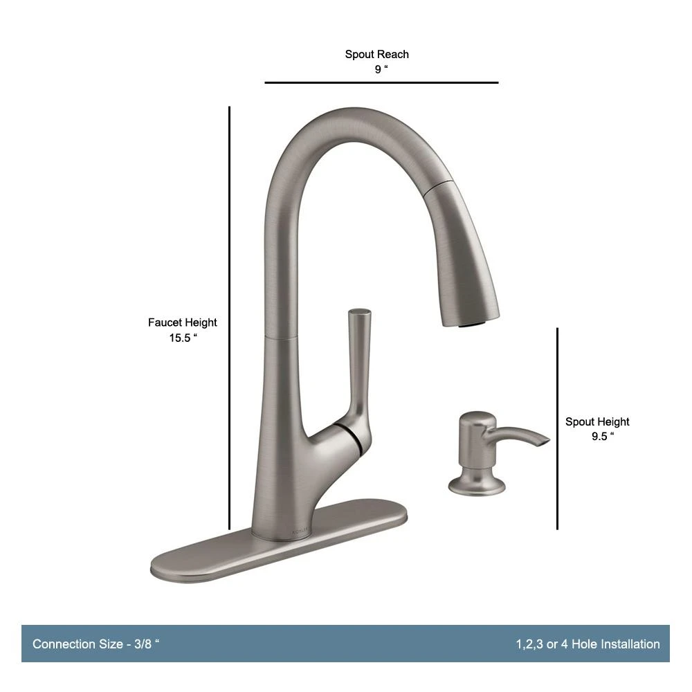 With clean lines and a high, arching spout, the Elmbrook pull-down kitchen faucet adds a contemporary feel to a classic look. It’s designed for easy installation and features premium materials for a lifetime of reliable performance. The pull-down spray head switches between stream and Sweep spray, and includes a soap/lotion dispenser.
