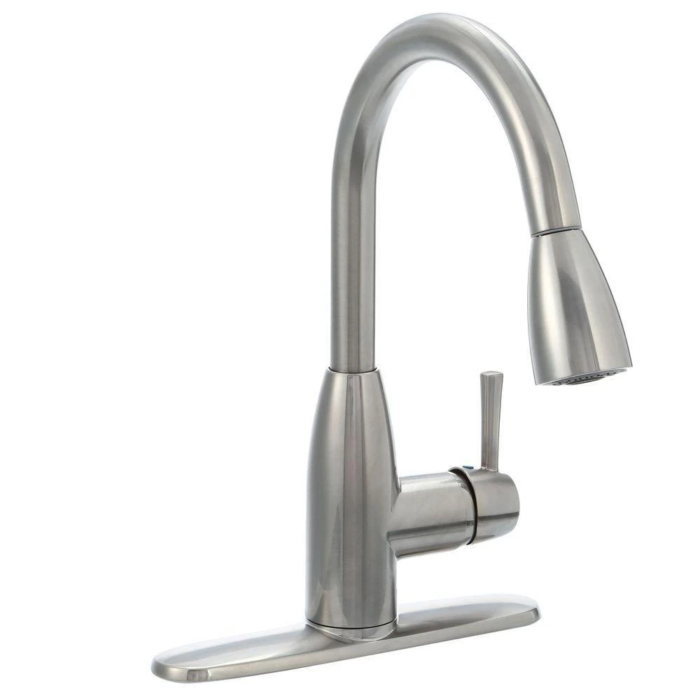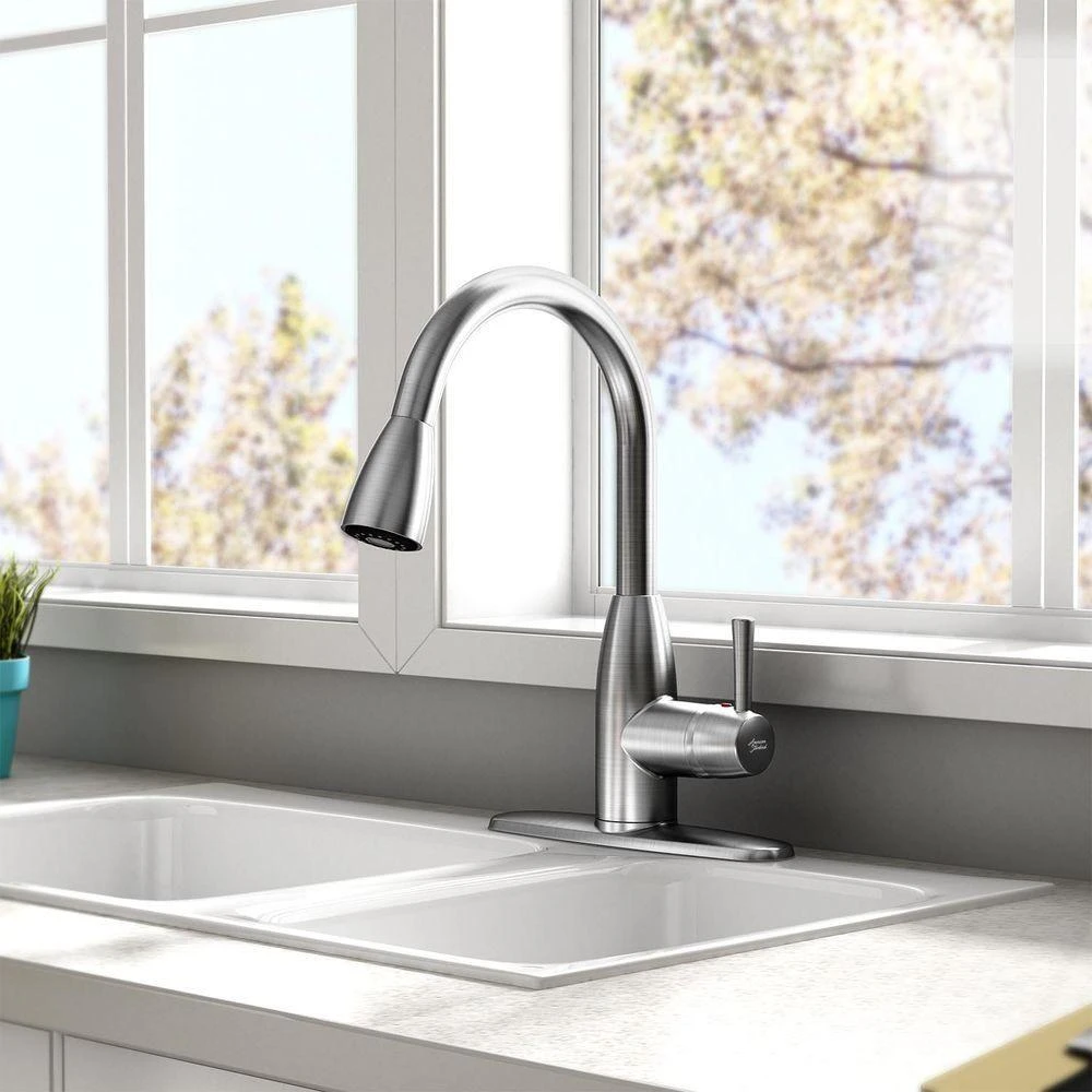 The Fairbury Single-Handle Pull-Down Dual Spray Faucet from American Standard updates your kitchen with statement-making style and superior functionality. This high-arc faucet with swivel spout makes it easy to fill large pots. Ergonomic, pull-down spray head provides a comfortable grip and push-button access to stream, spray and pause functions. This faucet is easy to install in kitchens with 1, 2, 3, or 4-holes in your sink or countertop, making it the perfect choice for any faucet refresh.