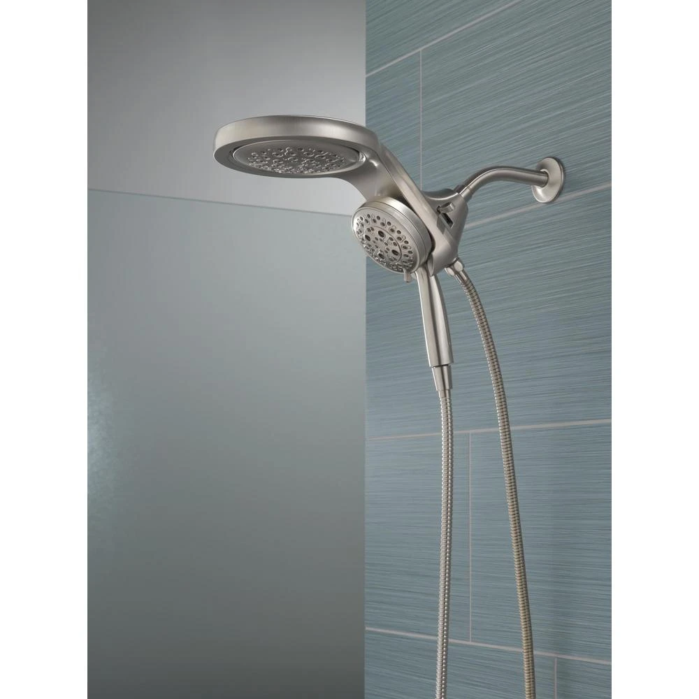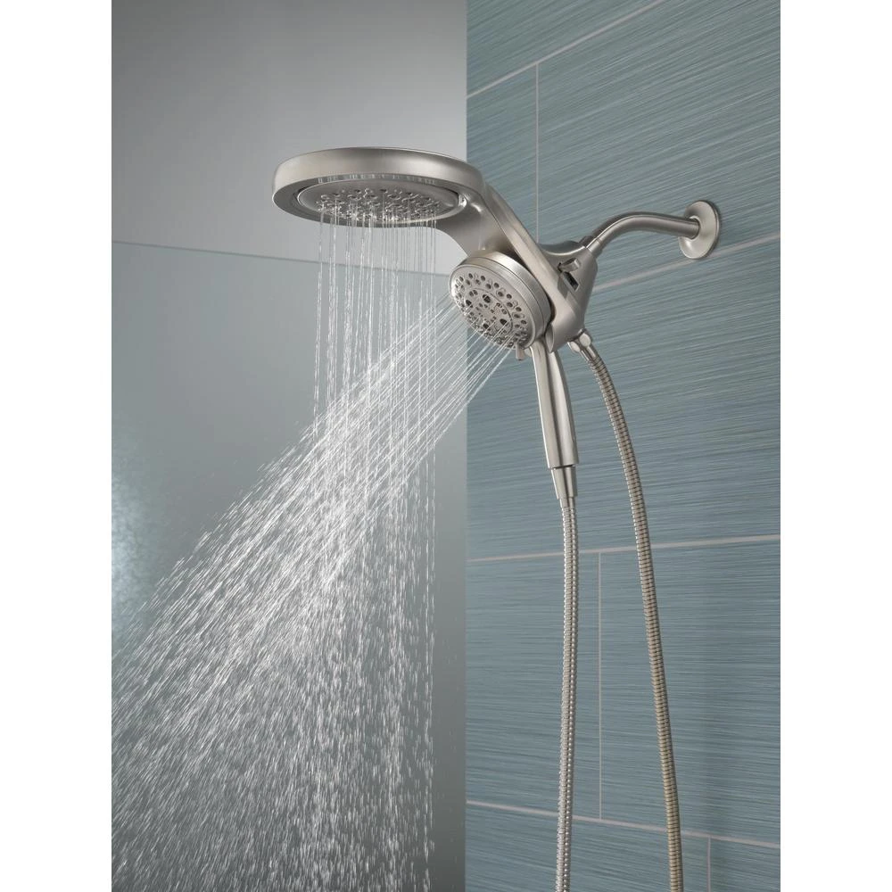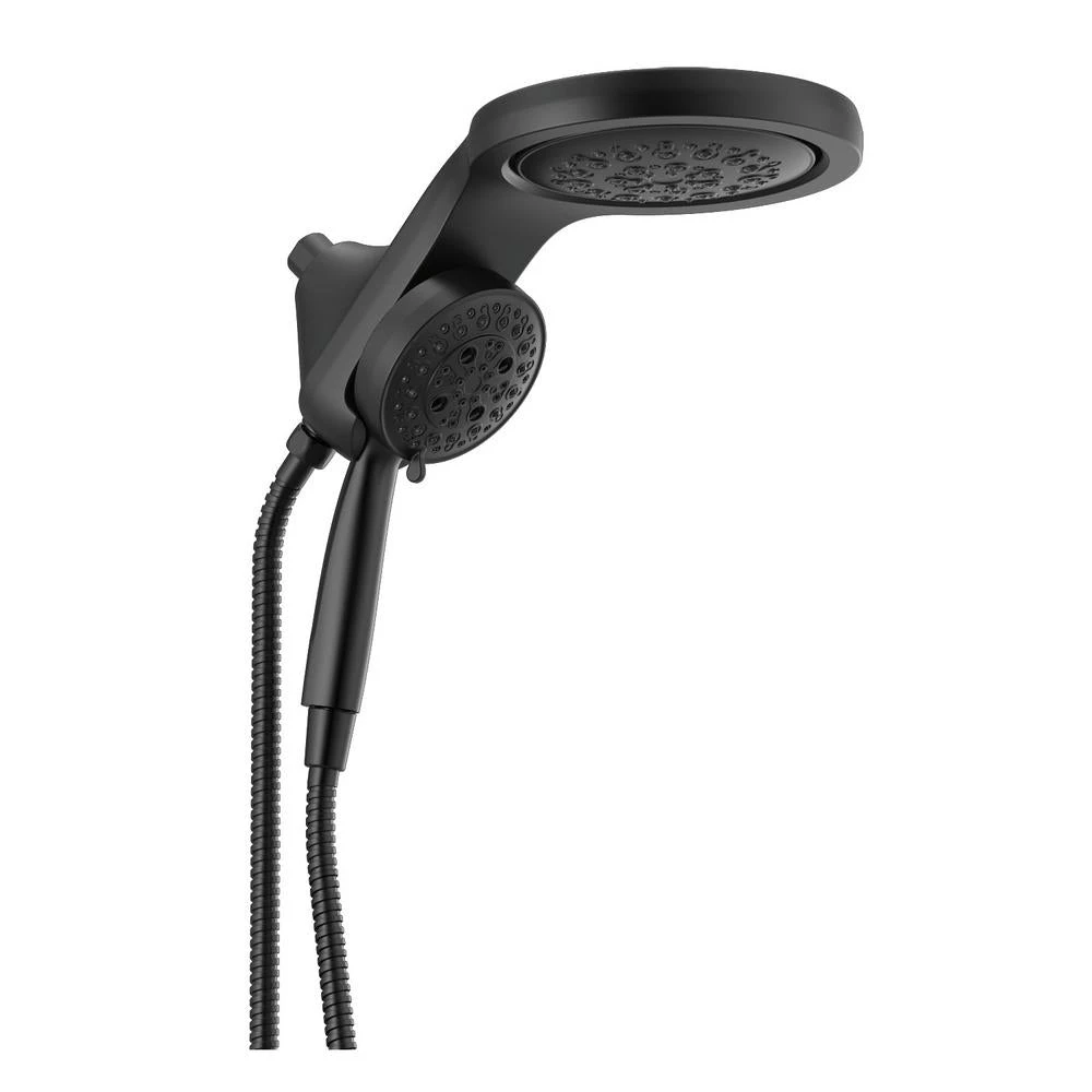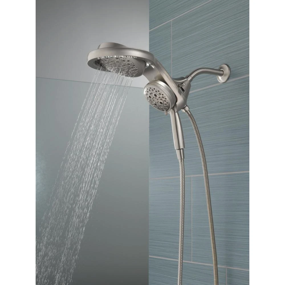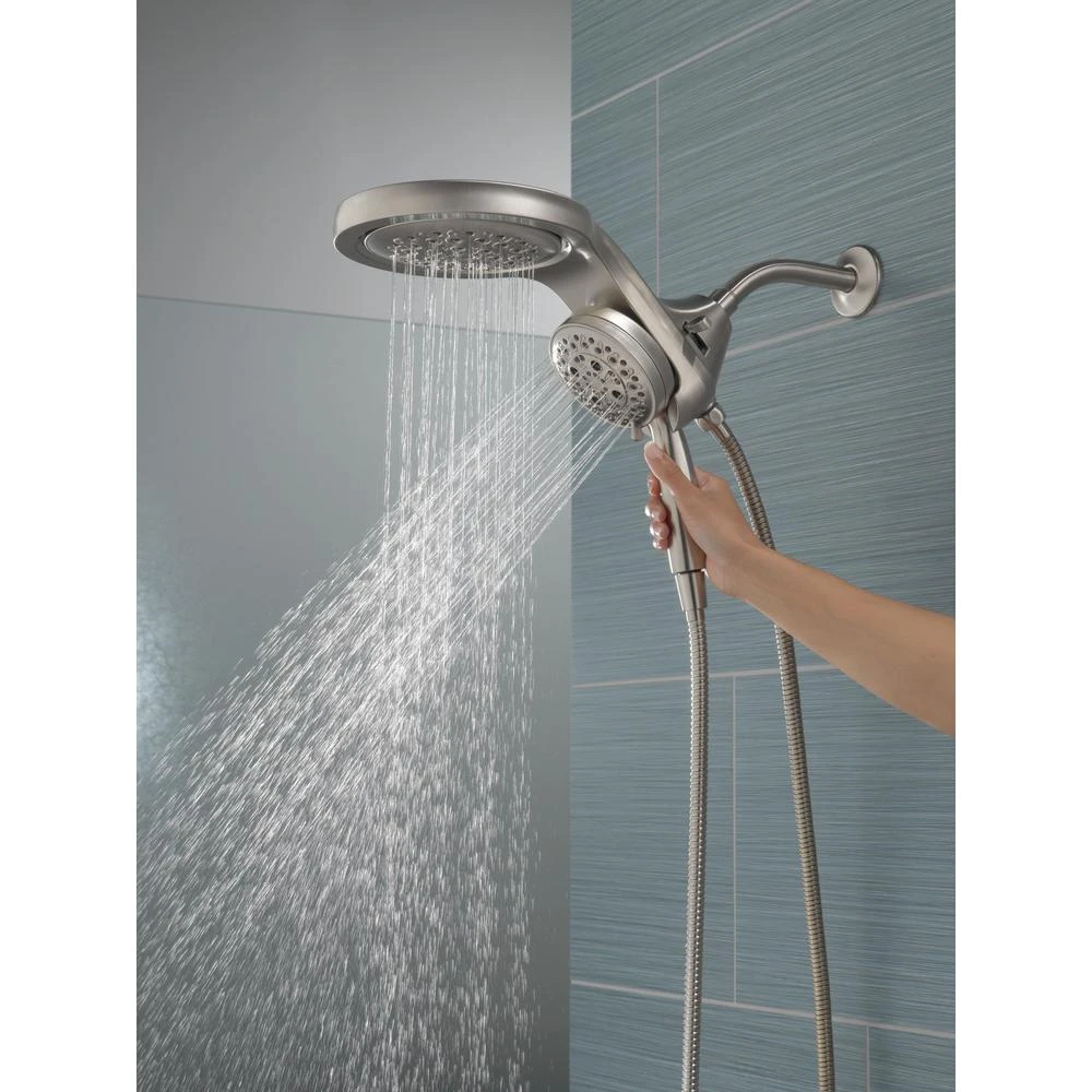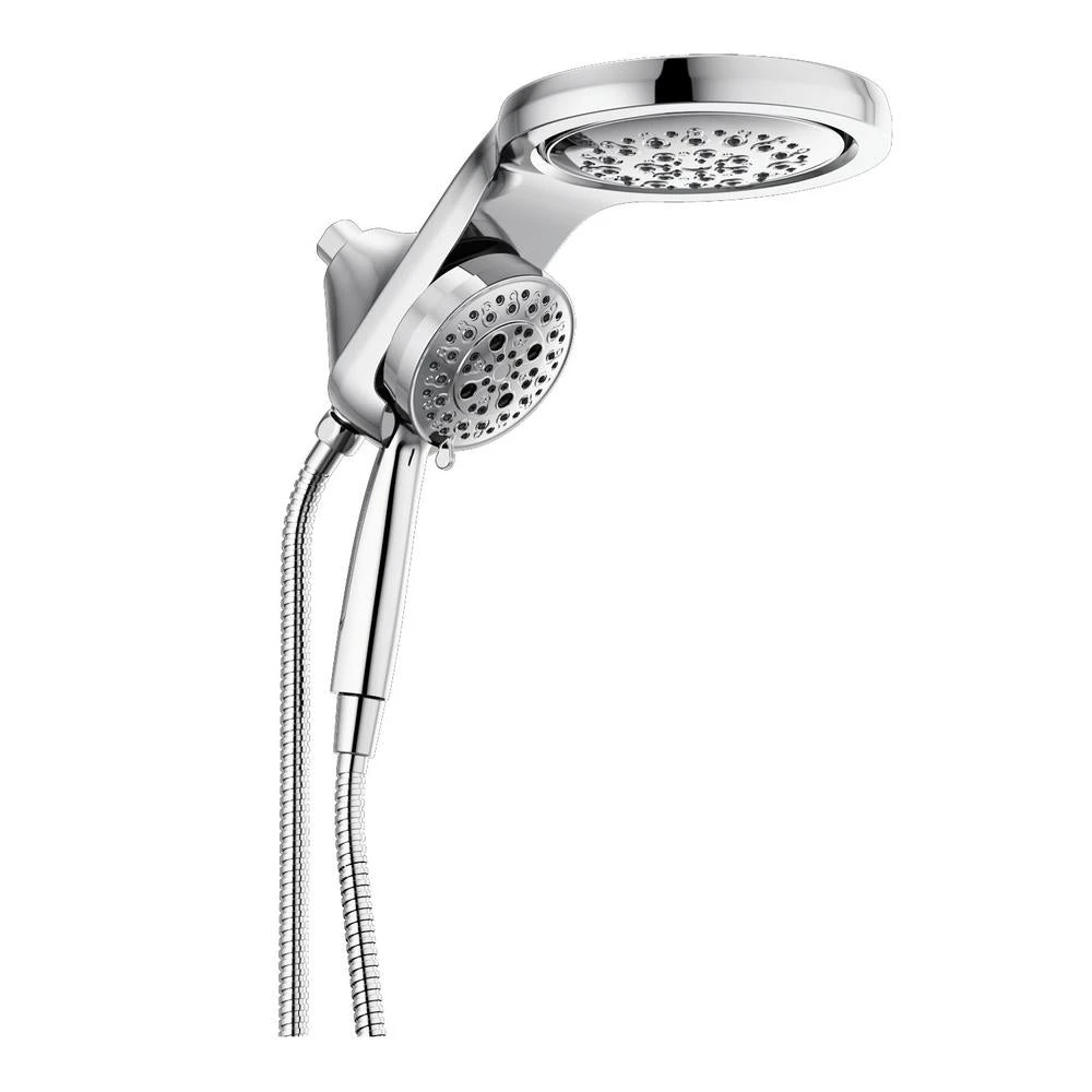 A Delta HydroRain H2Okinetic 2-in-1 Shower Head with hand shower completely transforms your shower with dual shower head functionality, featuring an integrated rain can and hand shower. The power of the rain can and hand shower together creates an immersive, spa-like showering experience that you can install in minutes to a standard shower arm, without altering the plumbing behind the wall. The integrated hand shower stays put every time you dock thanks to MagnaTite Docking and provides maximum flexibility and control when you need it, while the H2Okinetic PowerDrench Spray feels like more water, warmth and intensity without using more water. Don’t just take a shower, transform it, with a Delta HydroRain Shower Head. While other products may gather unsightly mineral build-up over time, Delta soft rubber Touch-Clean spray holes allow any mineral residue to simply be wiped away for an instantly refreshed look with no need for soaking or the aid of chemical cleaners. The pause setting gives you ample space for shaving, lathering and other shower tasks, without worrying about overspray or water waste. This spray setting helps you conserve water, so you can worry less about depleting your supply of hot water – and you help the environment too.