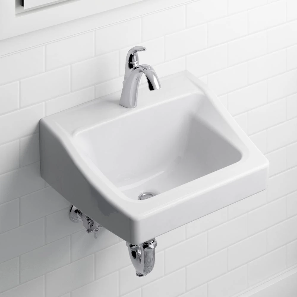This KOHLER Chesapeake Wall-Mount Vitreous China Bathroom Sink in White features a ledge back that accommodates a single-hole faucet drilling (faucet sold separately). The sink is ideal for commercial settings and is ADA compliant when installed per the requirements of Lavatories and Mirrors, Section 4.19 of the Act. The hard nonporous vitreous china construction withstands high-volume usage while remaining clean and sanitary.
