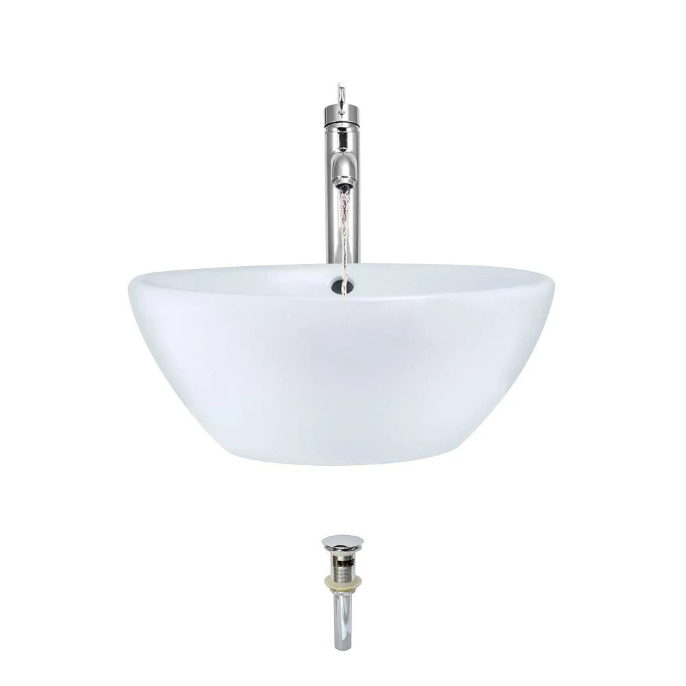 Durability and functionality define this beautiful sink, which presents itself cleanly and simply upon the vanity. As one of the smaller, circular vessel sinks in the porcelain line, it may be the perfect fit in a small bath and comes complete with an overflow. The additional vitreous china coating on this model creates an even more impervious and sanitary surface than standard porcelain. With an overall measurement of 16-1/8 in. x 16-1/8 in. x 6-3/4 in., it will require a minimum-width cabinet of 18 in. The 718-C vessel-style faucet features fully-tested, superior-quality, solid-brass components. This single-handle model is the tallest offering in its class, standing at a 13-3/8 in. H with a 4-3/4 in. spout reach. It features a chrome finish over its cylindrical design and comes with a matching baseplate. The rod-style handle atop the column swivels up-and-down or left-and-right, to control both water pressure and temperature; while ceramic disc cartridges assure long-term dependable operation. The faucet is constructed without lead and is compliant with NSF (National Sanitation Foundation) standards, the Safe Drinking Water Act, the cUPC (Uniform Plumbing Code of the United States and Canada), the ADA (American Disabilities Act) and carries the EPAs WaterSense label. Additionally, a spring-loaded, vessel pop-up drain (vpud) is included, which opens and closes with a simple press to its attractive chrome cap.