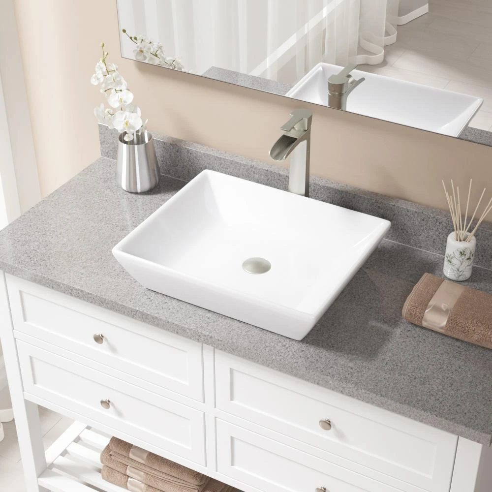 This basin features a low profile. Its straight exterior sides angle slightly up and outward from its level base, while its interior surfaces stretch upwards more gradually. Its soft rectangular form is elegant and highly polished. The additional vitreous china coating on this model creates an even more impervious and sanitary surface than standard porcelain. With an overall measurement of 19 5/8 in. x 16 in. x 4 1/2 in., it will require a minimum-width cabinet of 21 in. The 731-BN , single-handle, vessel faucet reaches a height of 12 1/4 in. and features a classic trough-style spout with a 4 in. reach. Its sleek lines gradually widen and contract to create a stunning design statement. The single handle has a flat top with an inverse curve below to mimic the spout design; and it easily sets just the right water flow and temperature. Ceramic disc cartridges assure long-term, dependable operation, and a beautiful brushed nickel finish completes its distinctive appearance. The faucet is constructed without lead, is compliant with NSF (National Sanitation Foundation) standards, the Safe Drinking Water Act, the cUPC (Uniform Plumbing Code of the United States and Canada), the ADA (American Disabilities Act), and carries the EPAs WaterSense label. Additionally, a spring-loaded, vessel pop-up drain (vpud) is included, which opens and closes with a simple press to its attractive brushed nickel cap.
