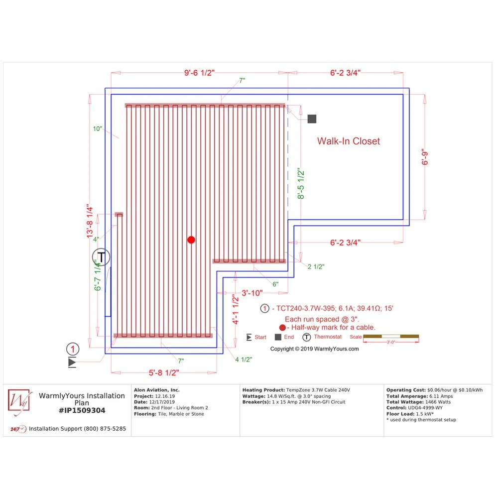 The WarmlyYours floor heating kit with cable is designed for applications until tile, stone and nailed hardwood floors. WarmlyYours TempZone Floor Heating Cable brings radiant warmth and comfort to any room. This free-form cable provides the ultimate in flexibility, making it easy to customize installation for rooms of any size and shape. While ideally suited to provide complete floor heating coverage of rooms with unusual dimensions, the TempZone Floor Heating Cable can be used in any room, providing an alternative for installers who prefer the flexibility and freedom of working with loose cable. TempZone Floor Heating Cable is ultra-low EMF by design. It features a twin conductor with a 15 ft. cold lead and it can be installed at 3 in. or 4 in. intervals to meet the needs of any installation. Along with comes the programmable nSpire Touch which features a 3.5 in. full color touchscreen and a modern design that instantly augments any room’s style. With an integrated Install Wizard, it’s never been easier to set up a radiant heating system according to your preferences and schedule. The nSpire Touch allows you maximum control over the floor temperature with 4 programmable events for each day of the week, which is great for Goldilocks households where there will be frequent adjustments to the temperature or thermostat’s schedule until it’s just right. This dual voltage (120-Volt/240-Volt) thermostat puts the control where it belongs, at your fingertips. Includes floor sensor.